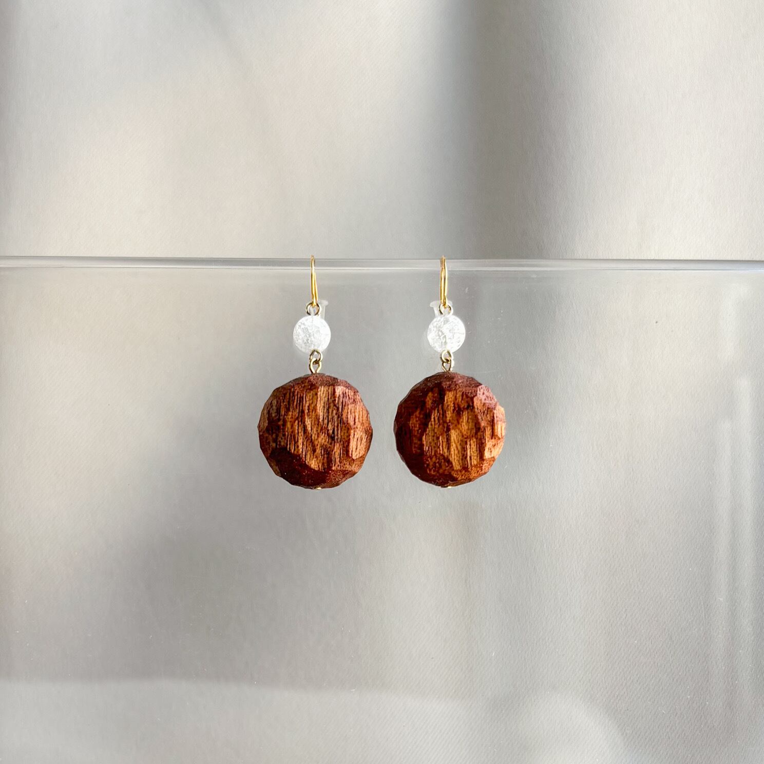 素材:マホガニー、クラック水晶、ゴールドフィルドピアスフック